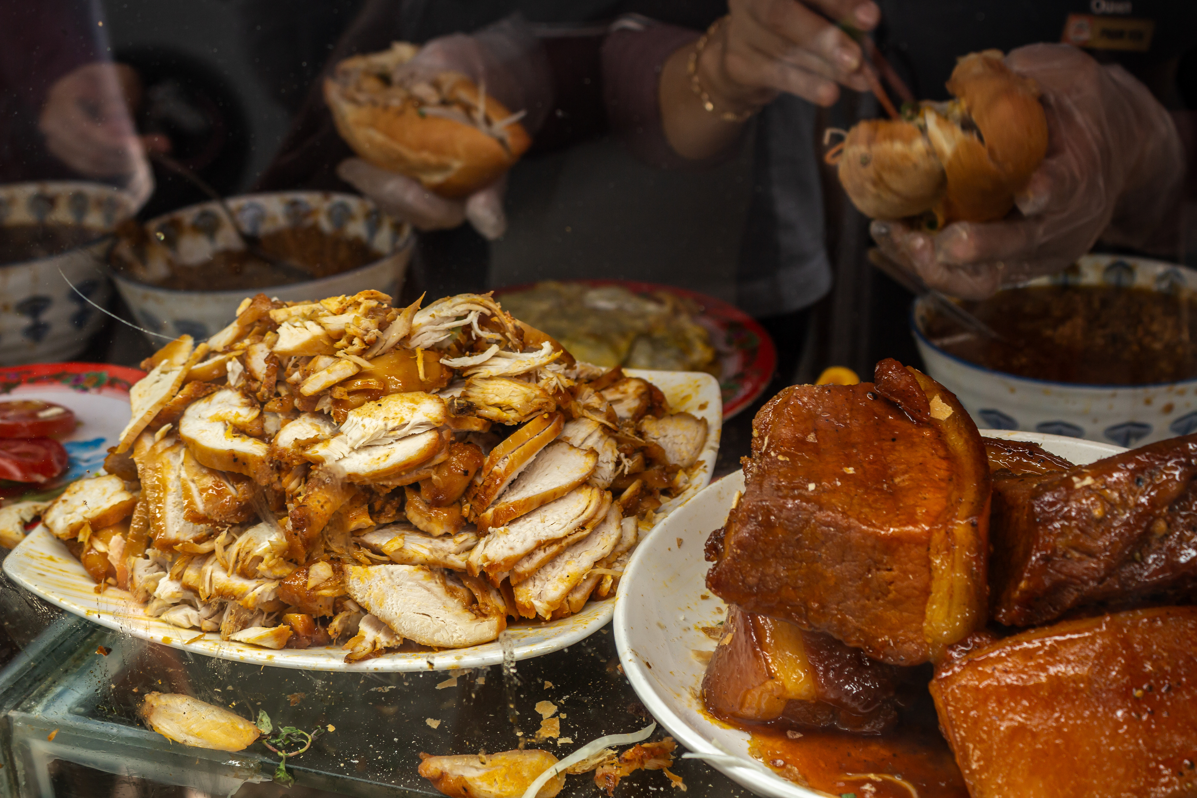 Com Ga (Chicken Rice) – Fragrant rice with shredded chicken, herbs, and chili sauce.