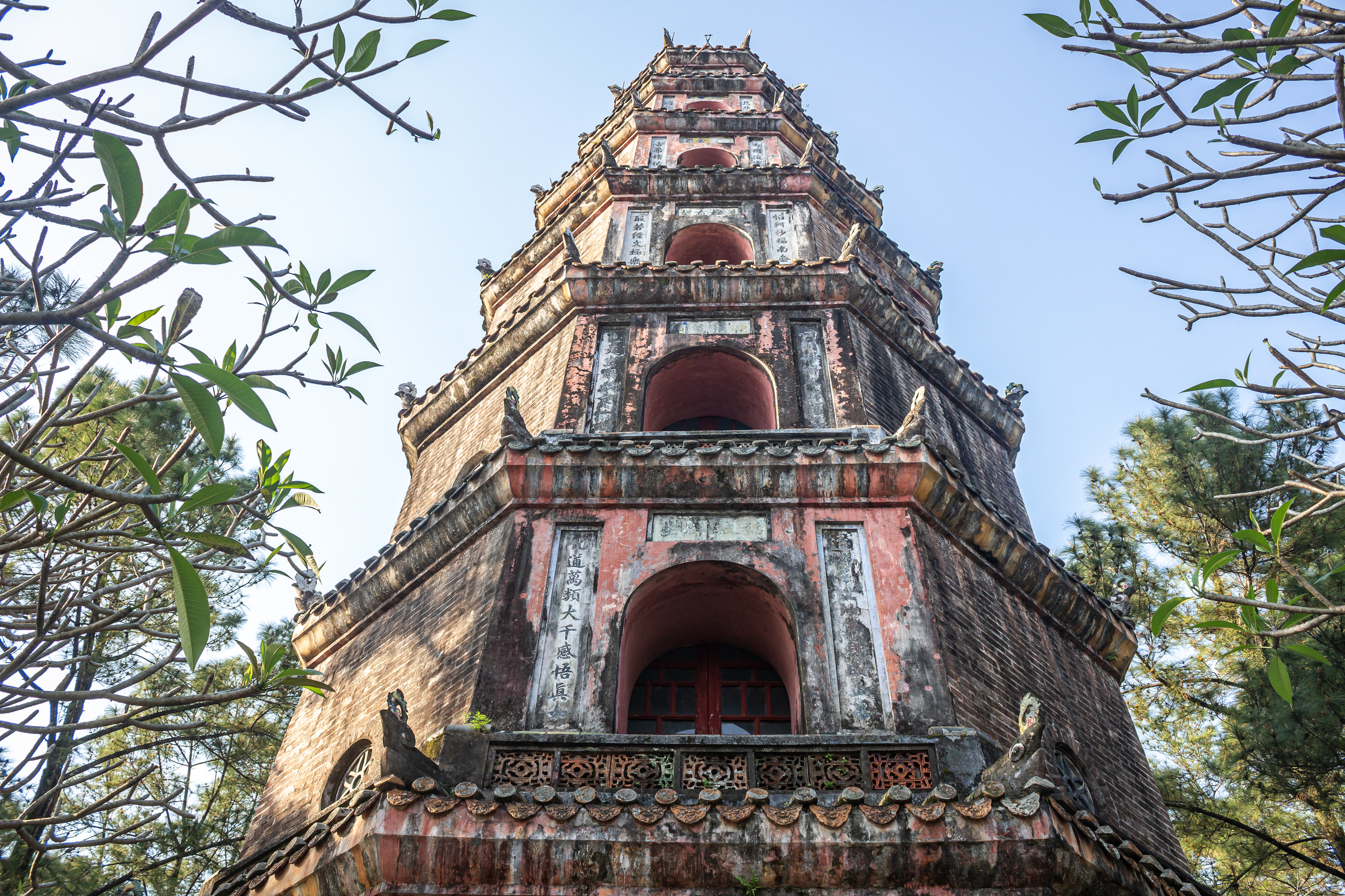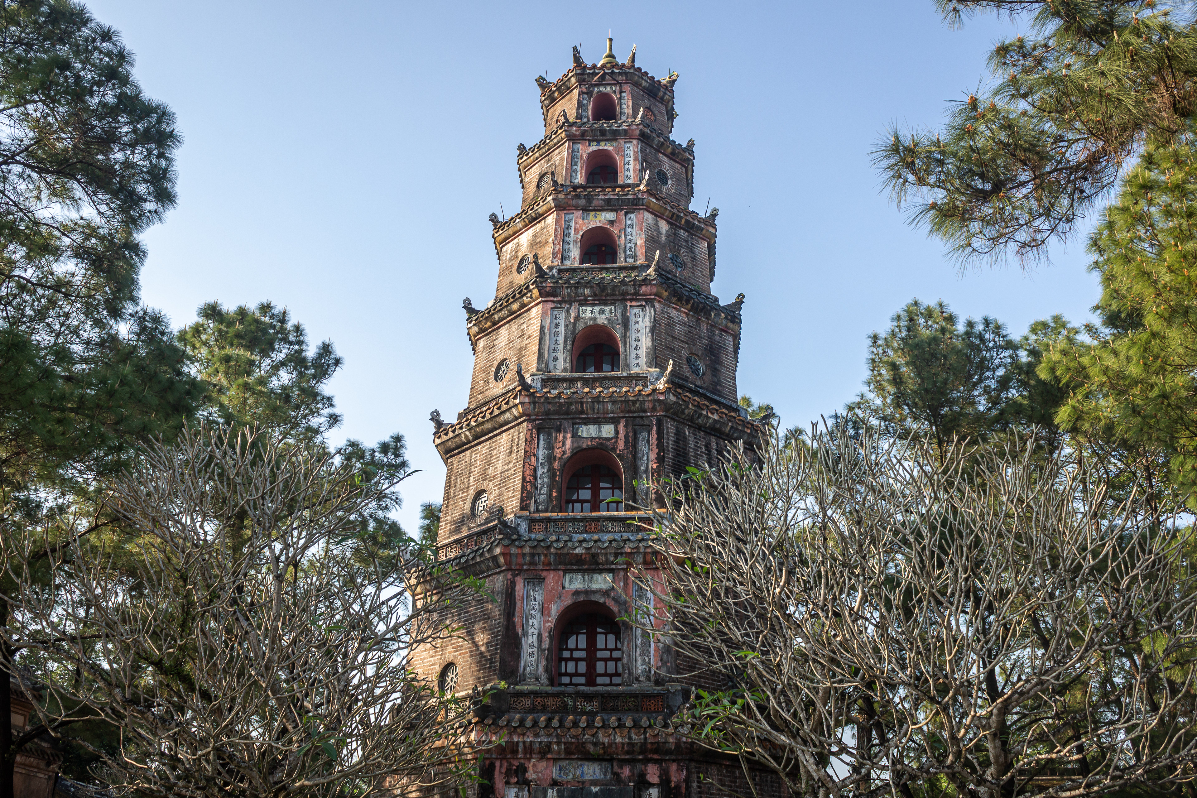 Perched on a hill overlooking the Perfume River, Thien Mu Pagoda is one of the oldest and most beautiful religious structures in Vietnam. The seven-story Phuoc Duyen Tower has become a symbol of Hue.